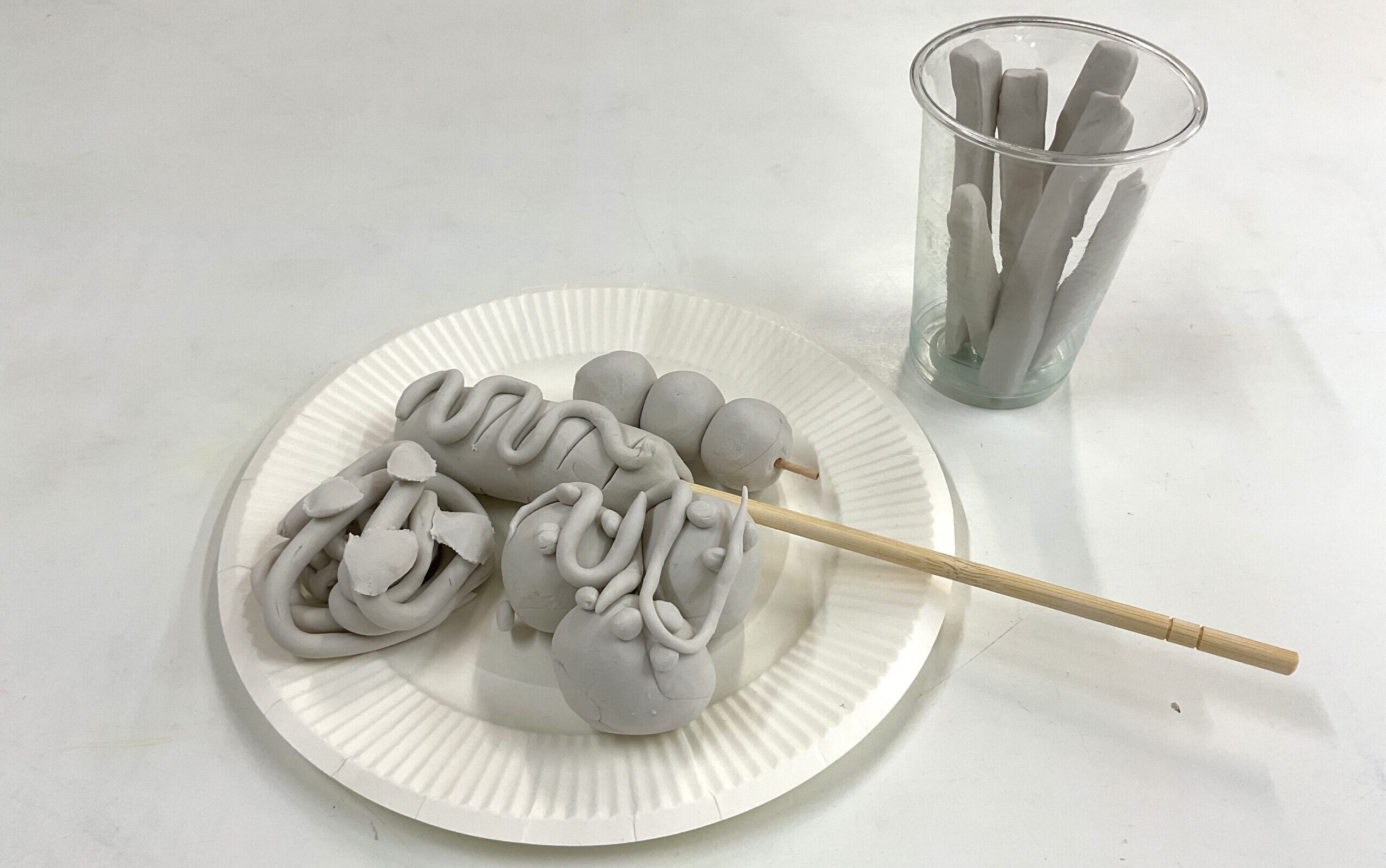 身の回りに興味関心を広げ、表現することを目的に、ねんどを使ったテーマ制作に取り組んでいますが、『お祭り』と言えば屋台! まずは、どんな食べ物があるかな~と想像力を膨らませるところから始めます。たこ焼きやフランクフルト、フライドポテトや焼きそばにおだんご等、見本のイラストを見ながら作っていきました。                                    例えば「たこ焼き」は、ころころと手の平で丸くしたねんどの上に、細~く伸ばしたねんどを、ソースとマヨネーズに見立てて、くねくねとかけていきます。仕上げに、小さく丸めたねんどの天かすをかけて完成です♪                                       ねんどをちぎる・丸める・細く伸ばす・道具で切るなど、手のひらや指先の細かい動きを