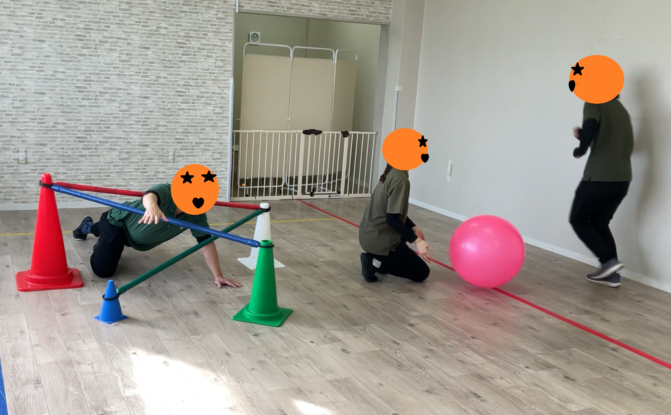バーやコーン、とびいし、バランスボール、マットなどを使用したサーキットに取り組みます。最初はバーをまたいだり、くぐったりするエリアから始まります。バーの高低差によってどうしたらぶつからずに進めるのか考えたり、くぐるのかまたぐのかを素早く判断することにも取り組みました😊