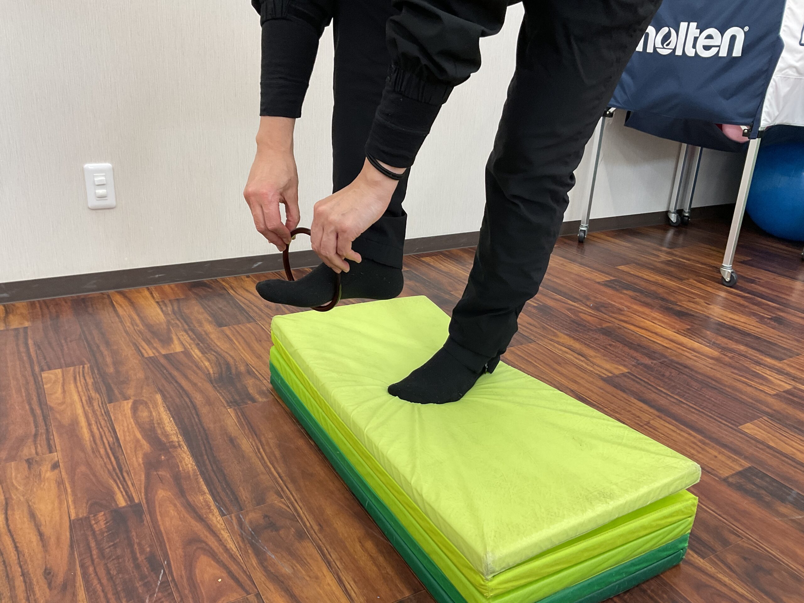 内容としてはプラスチックリングを床もしくはマットに座った状態から両手でリングを持ち、片足に通し膝まで上げまた足先に向けてリングを取るかたちとなっています。右足に何本、左足に何本と通す個数を決めたり、立った状態でフープから出ないように通す等、子どもたちが楽しめるような工夫や個人差や年齢に応じて難易度の調整も行なっています。