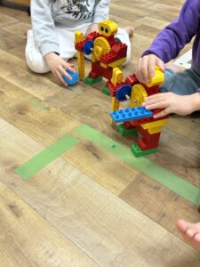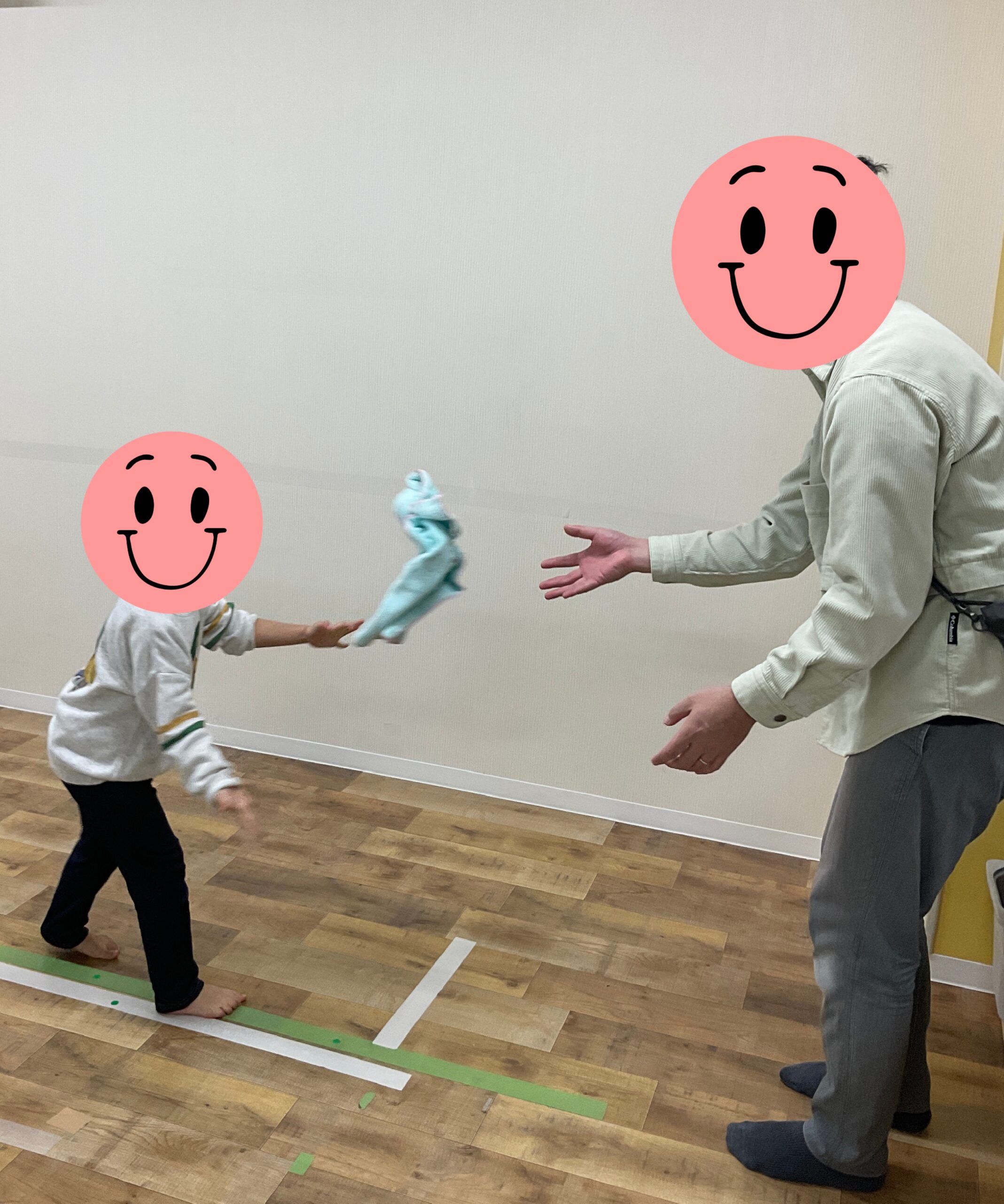 親子遊びでは、タオルを使い、上に投げてキャッチ、つなひき、しっぽとり、タオル滑りなどで親子で楽しみました。しっぽとりは大人のズボン後ろにタオルをしっぽのようにぶら下げて、子どもと向かい合い、左手を繋ぎ、右手でしっぽ(タオル)を取る遊びです。目が回りそうになりますが、しっぽが取れると大喜びでした。空間認知の遊びになります。