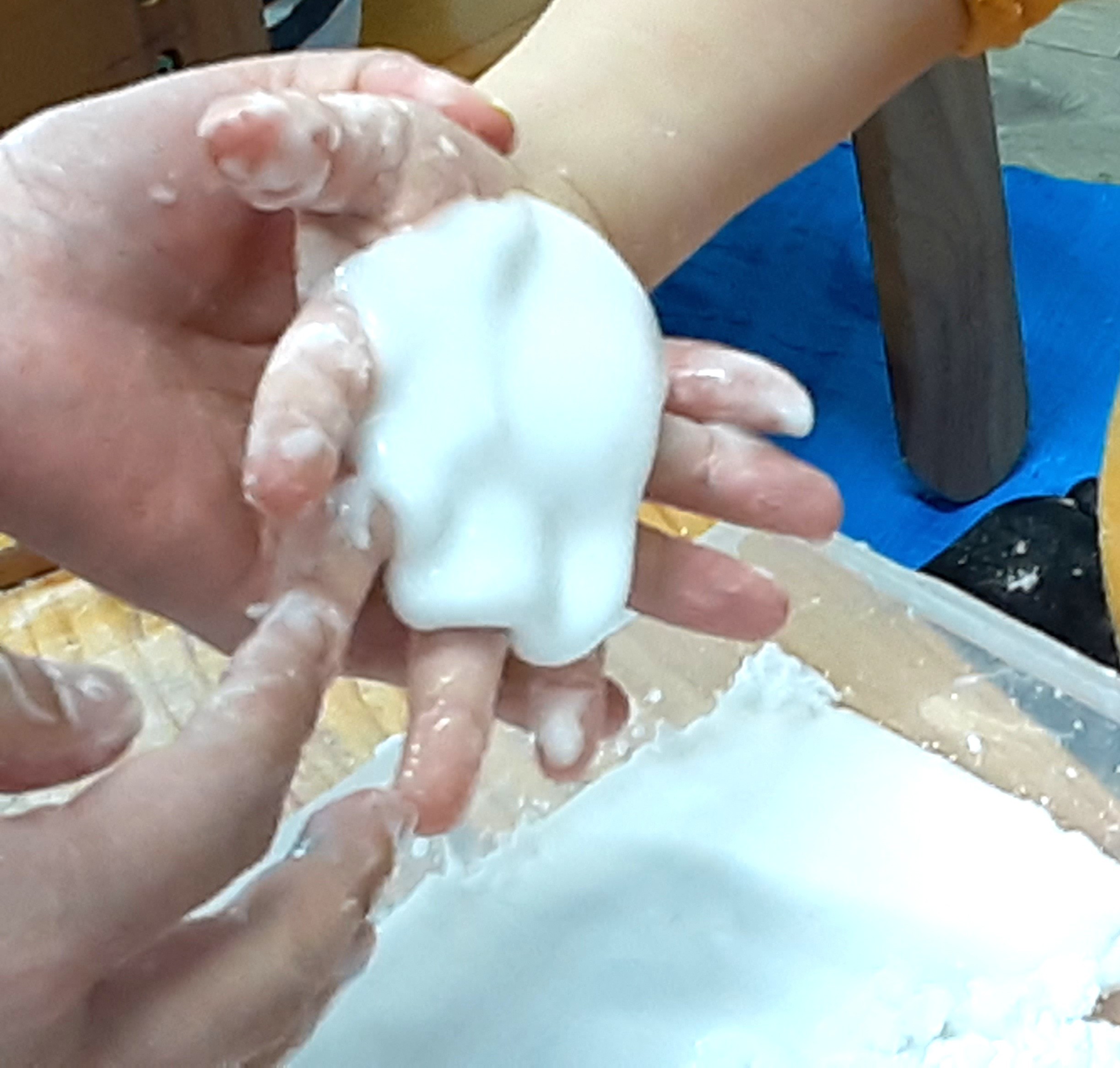 ③ スタッフが作った柔らかいお団子を、子どもの手にのせると~!?あら不思議!すぐに形が崩れてスルスルと指の間から抜けていきました。その様子と感触に「どうして~?」と好奇心が高まり、子どもたちは大喜び!