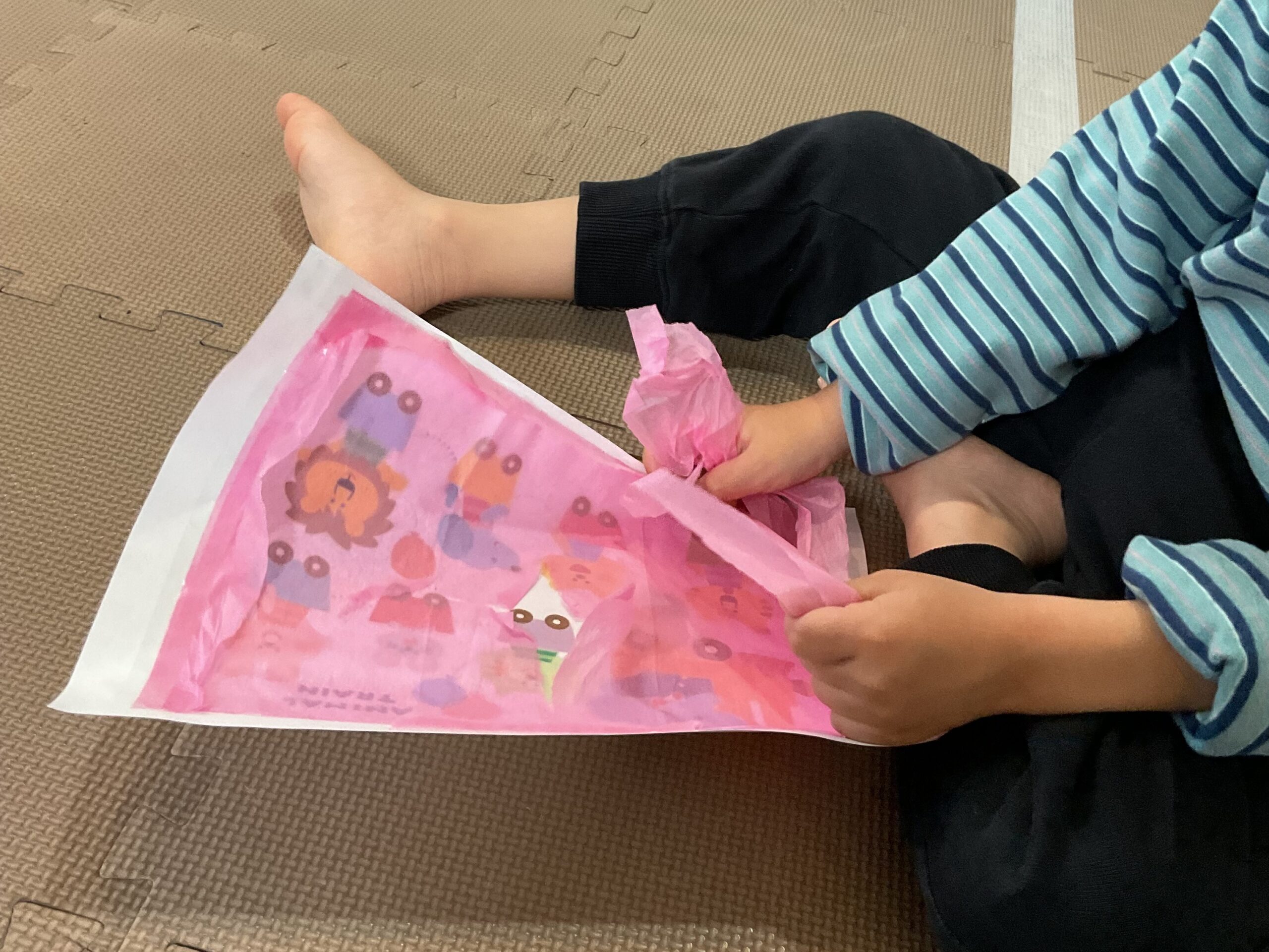お子さんが興味を示しそうなイラストを印刷し、その上に花紙を重ねて辺の部分を貼り合わせます💡なかなか手に力が入らず両手で紙を持つことが難しいお子さんには、片手でちぎる事から始めました。スタッフがモデルを示し何をするのかを身体介助で伝えると、少しずつ介助を緩めてもちぎる姿が見られました!