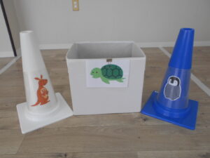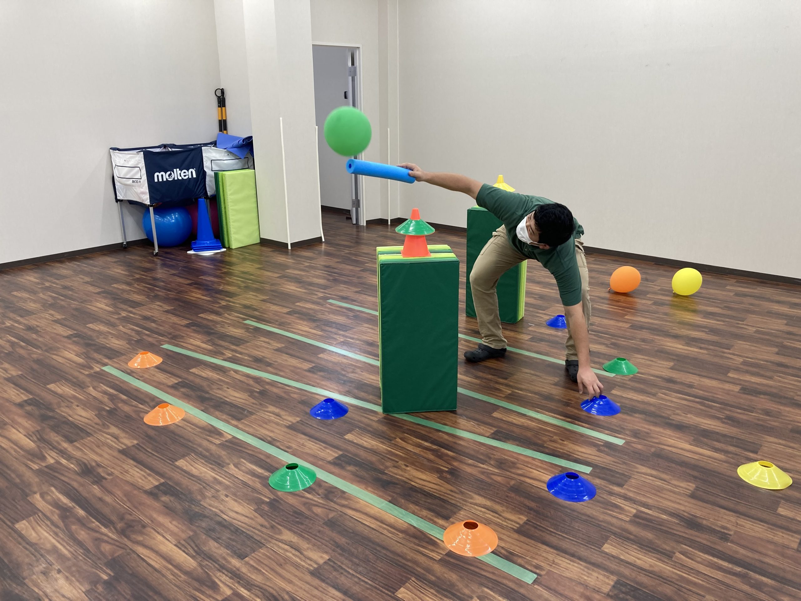 スティックで風船を落とさないようにウォーミングアップします。風船を上にあげながら、床に散らばったマーカーを拾ってマットの上に置いていき、すべてのマーカーをマットの上に置ければクリア!⭐