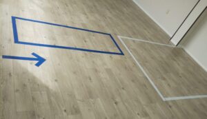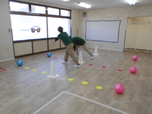 (写真は、転がしドッジ:四角のテープで囲って外から転がってくるボールに当たらないように避けます)