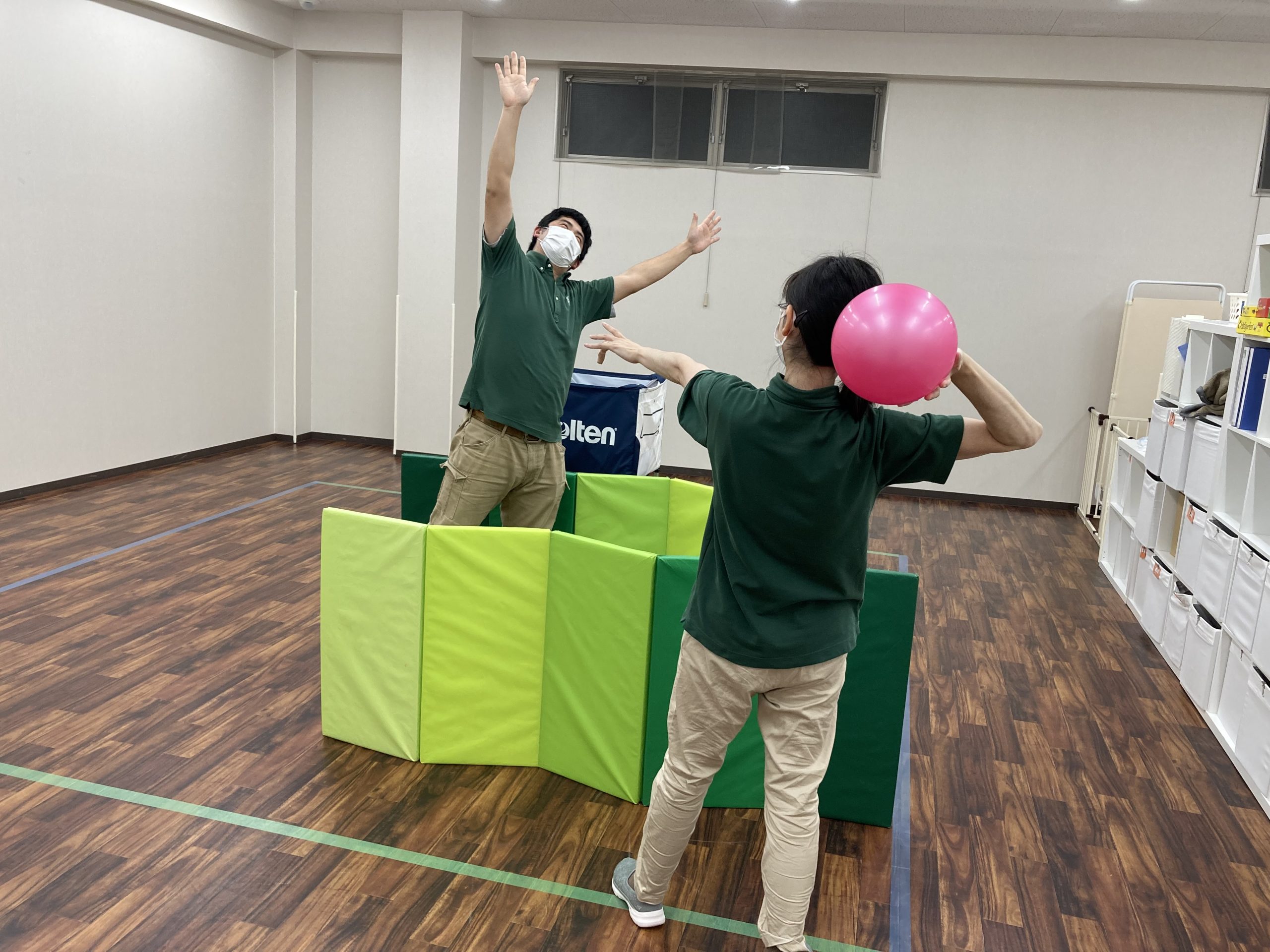 はじめは、パスはバウンドでもOKで、慣れてきたらマットの間のスタッフを増やしパスの邪魔をしたりマットの距離を遠くしたりして難易度をあげていきます。また、投げる側と取る側を交代して取り組んでいます。