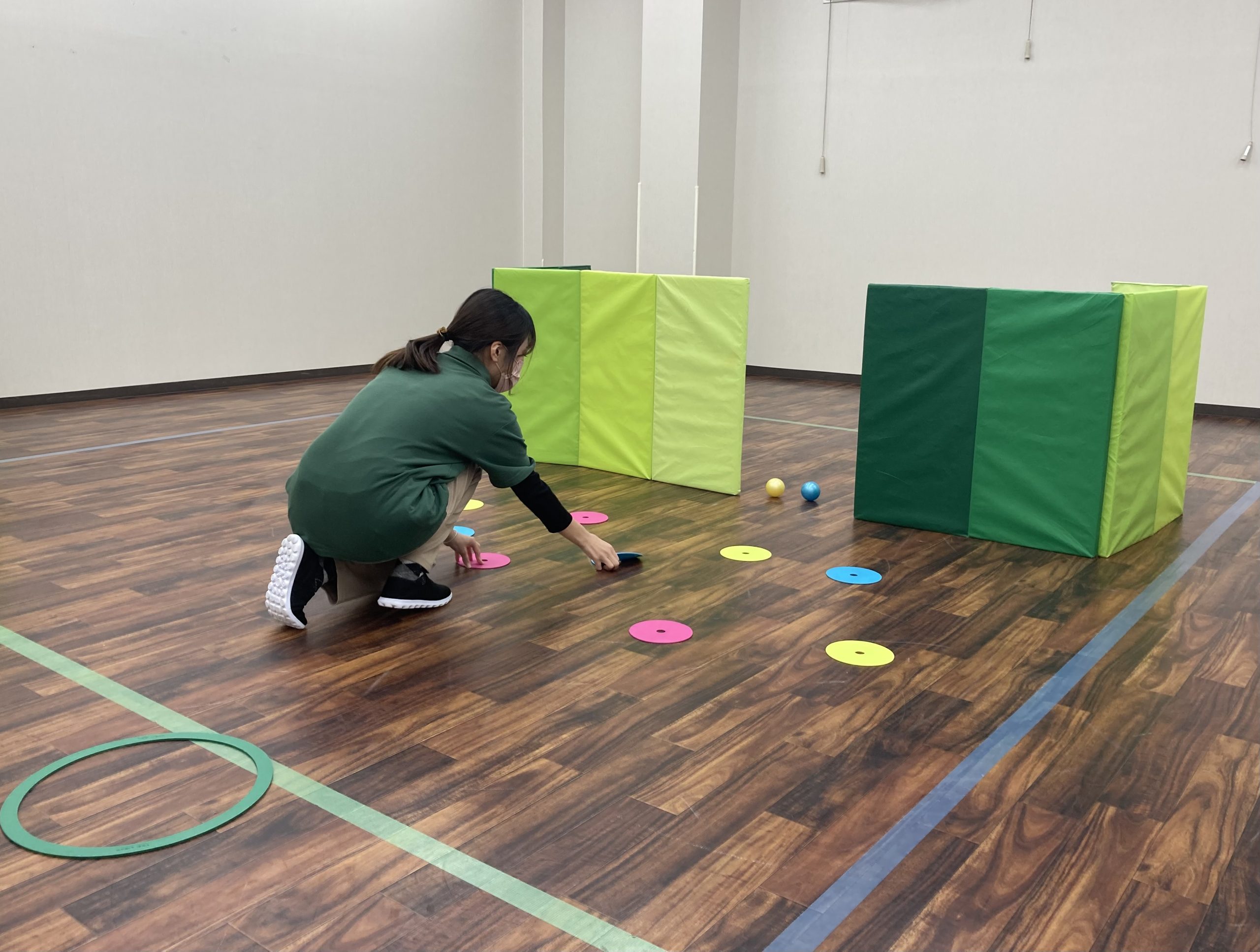 マットを立てたところからスタッフがボールを転がし、見えた色と同じ色のマーカーを探して拾い集めます。スタート位置に戻って繰り返し行うプログラムです。⭐