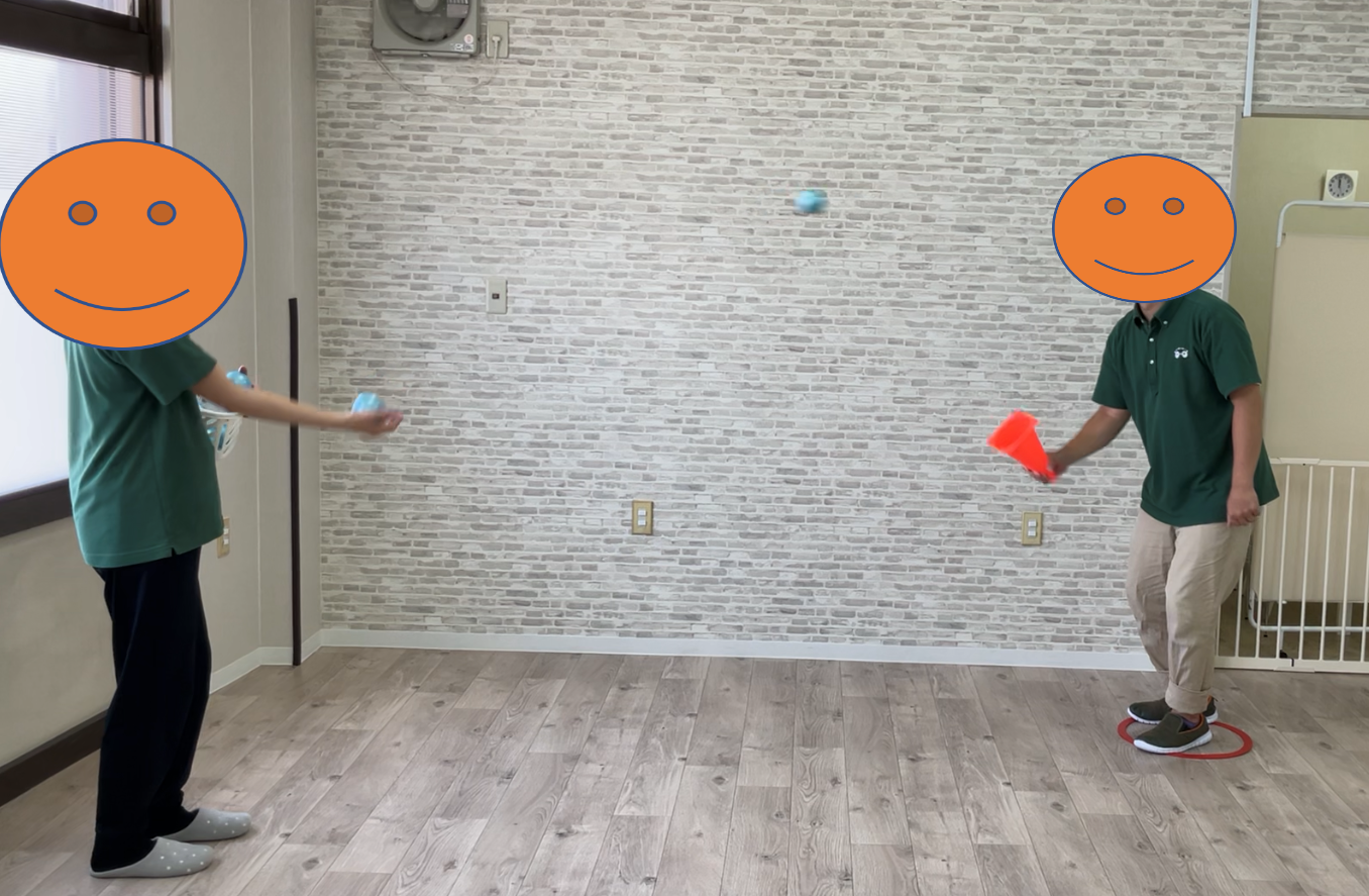 慣れてくると、ボールのとんでくる場所や動きに合わせてコーンを動かしたり、直接落ちてくる場所に移動してとれるようになってきます