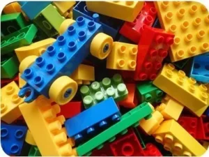 次にピザをブロックで作り、様々な色のブロックを材料に見立てて会話をしたり、