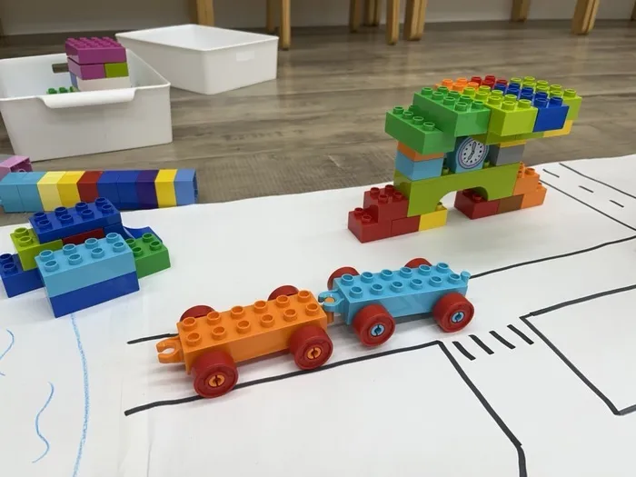 写真は実際に子どもたちが作った作品です今回はブロックで建物や乗り物を作った後に、模造紙へとそれぞれ相談しながら配置し、ままごとで探検しながら楽しみました