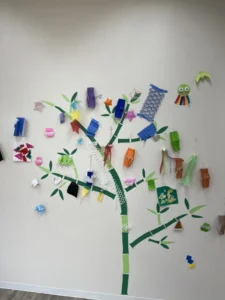プログラムアートのひとつとして、ねんどを行いました。ねんどに限らず、アートの活動は服が汚れる活動も多く、必ずスモックを着て行います。