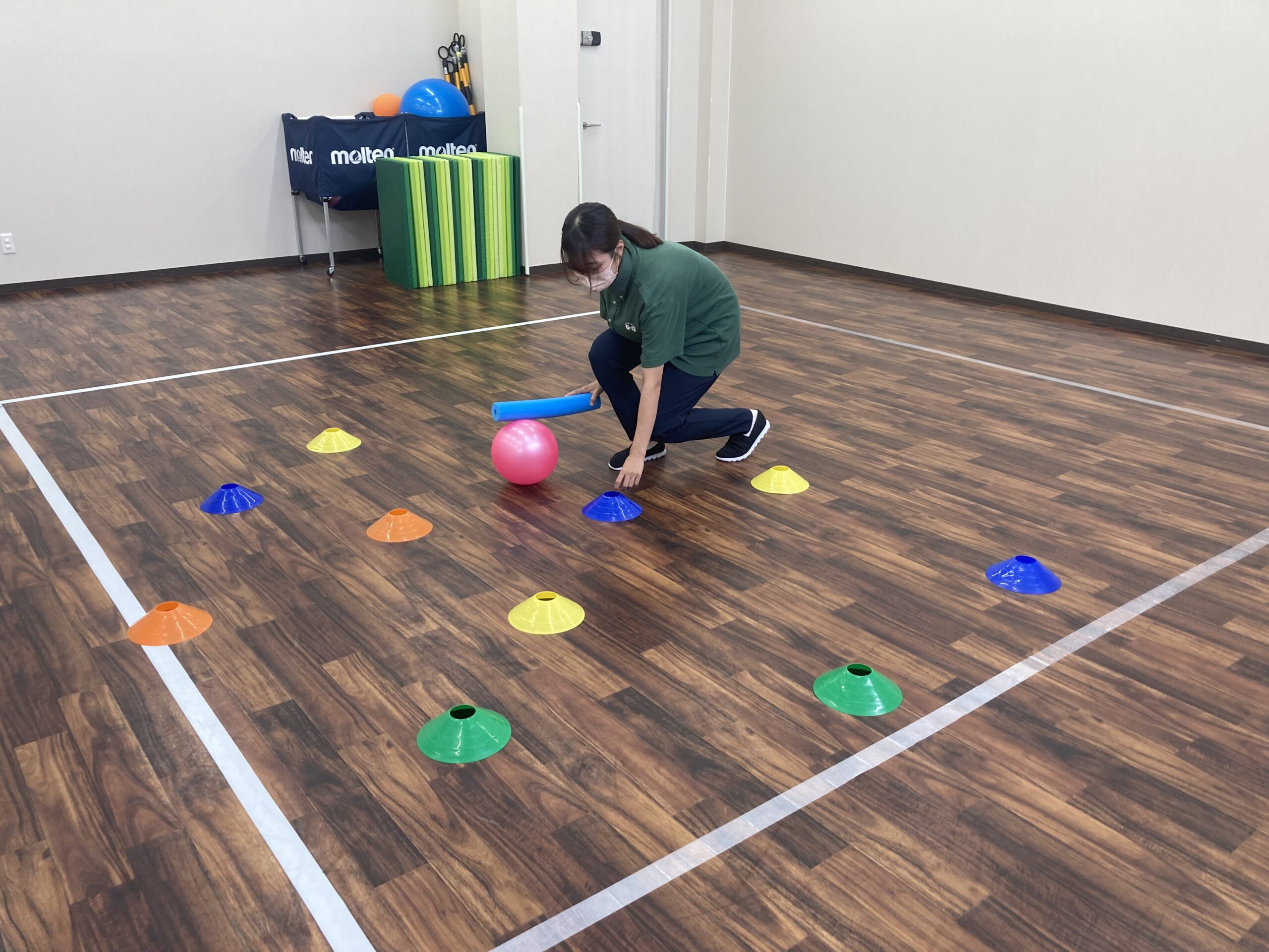 まずは、スティックでボールを転がします。散らばった色々なマーカーの中から、スタッフが伝えた色を見つけて集めていきます。色を視覚で見せるときもあれば、口頭だけの指示で伝えるときもあり、子どもたちに合わせて取り組んでいます。ボールのコントロールに苦戦している子どもたちもいますが、スティックなどの道具を使う機会でもあるので、スタッフが横について伝えながら取り組んでいます。