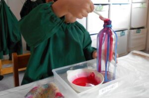 利用児さんには、ボールをスティックで転がしながら