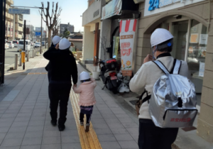保護者の方は、大きい福笑いに苦戦!目を瞑り、歩幅を考えて顔のパーツを置きに行くのが