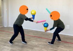 スタッフがバウンドさせたボールを両手でキャッチして、フラフープなどの入れ物に入れます。