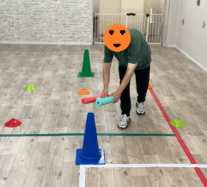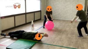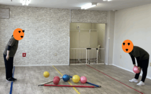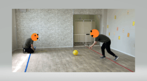 始めはボールを近くに転がしてキャッチすることから取り組み、慣れてくると、ボールを遠くに転がしたり、ボールをバウンドさせたり、徐々にレベルをあげて行っています。