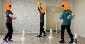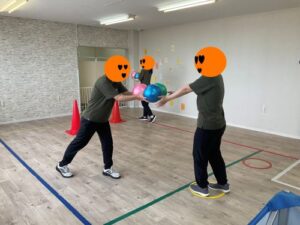 リングの中でボールをもち、離れたスタッフに向かってボールを投げて渡します。ボールを受け取ったスタッフがボールを反対側に投げます。その投げたボールを走ってキャッチするプログラムです。