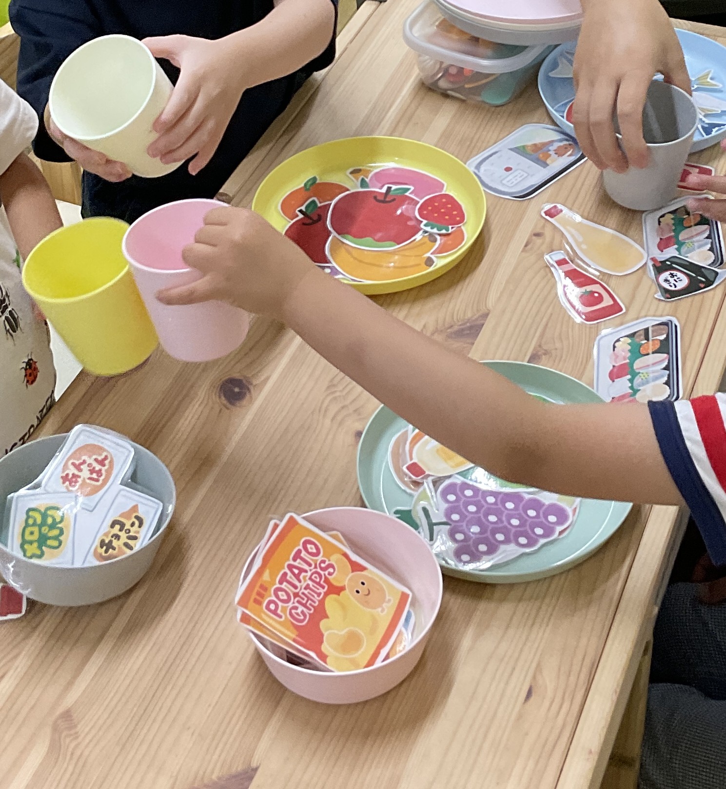 イクリノでのごっこ遊びでは、社会性を育みます。日常生活を再現するのに、役割を分担し、なりきってあそびます。今回は身近にあるお買い物ごっこに取り組みました。