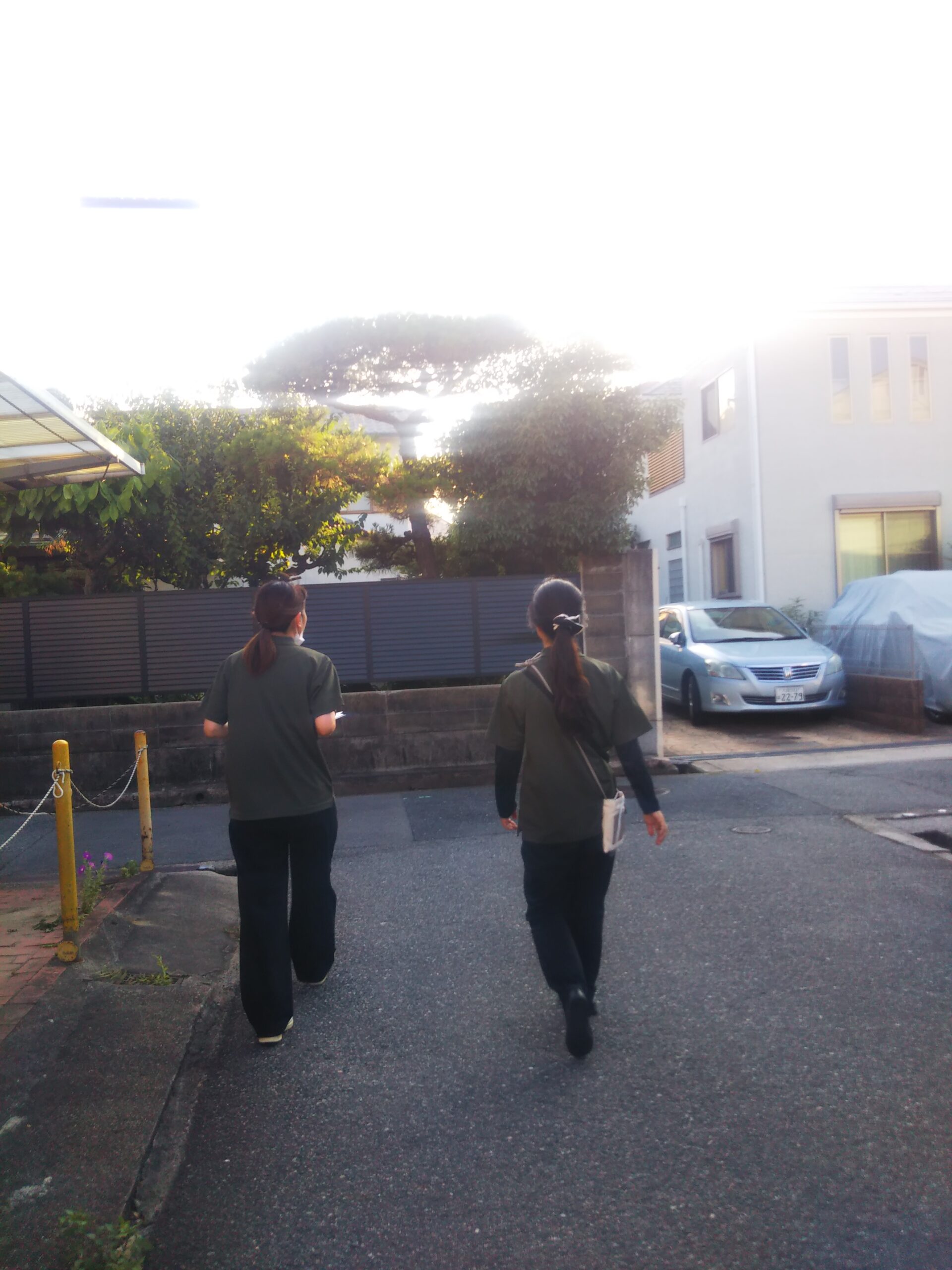 IQLino豊中校の避難場所は、近くの中学校と公園を設定しています。今回の避難訓練前には、スタッフだけで避難経路を確認しながら実際に歩いてみました。子どもと歩くならこっちよりあっちの方が安全なのではないか、ここの葉っぱ尖ってて危ないね、など実際に歩いてみるから分かることもありました