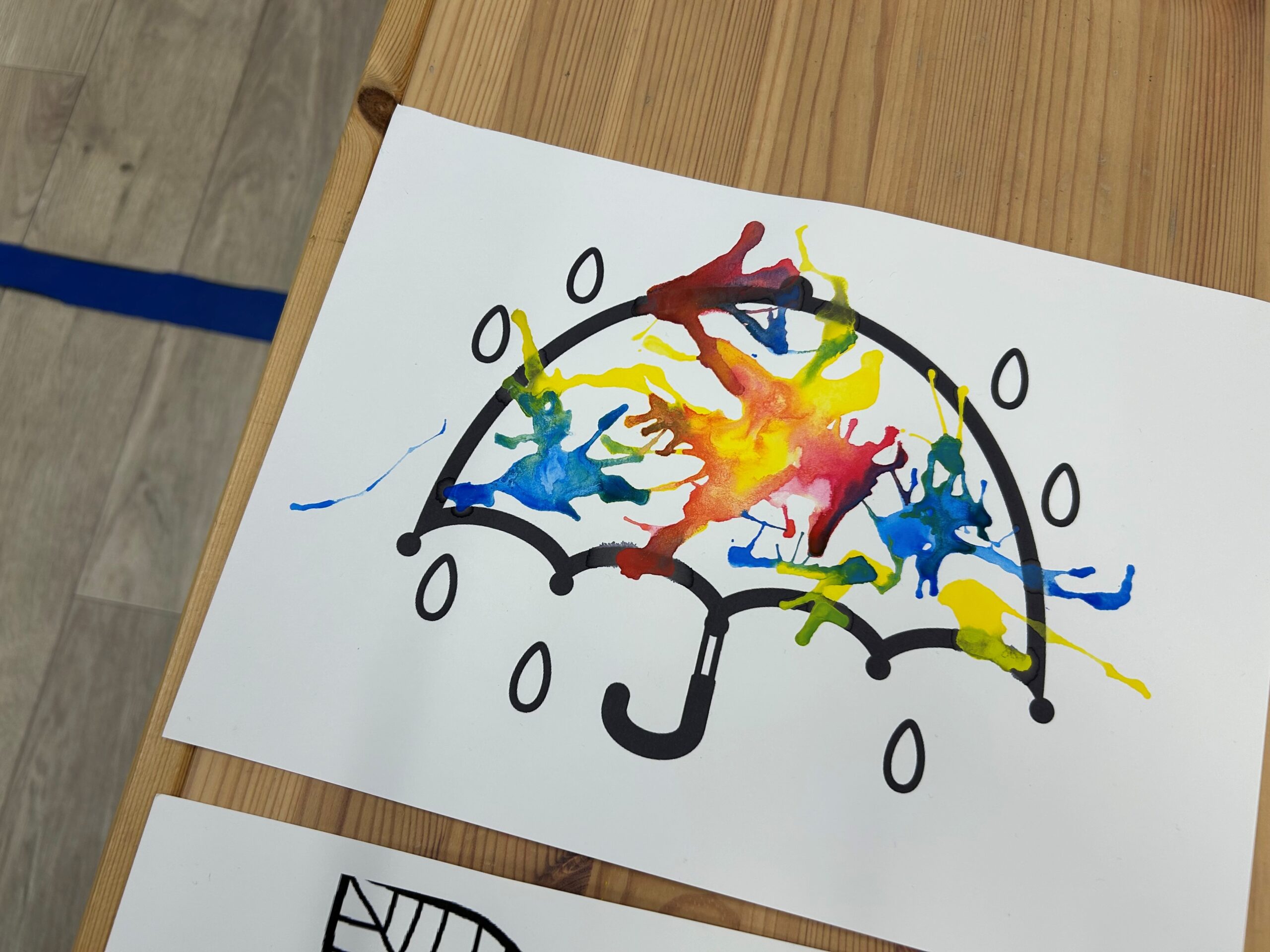 偶然できた形や色、混合を楽しんだり発見したりすることで色彩感覚や感受性を伸ばしていくことをねらいとしています☆彡