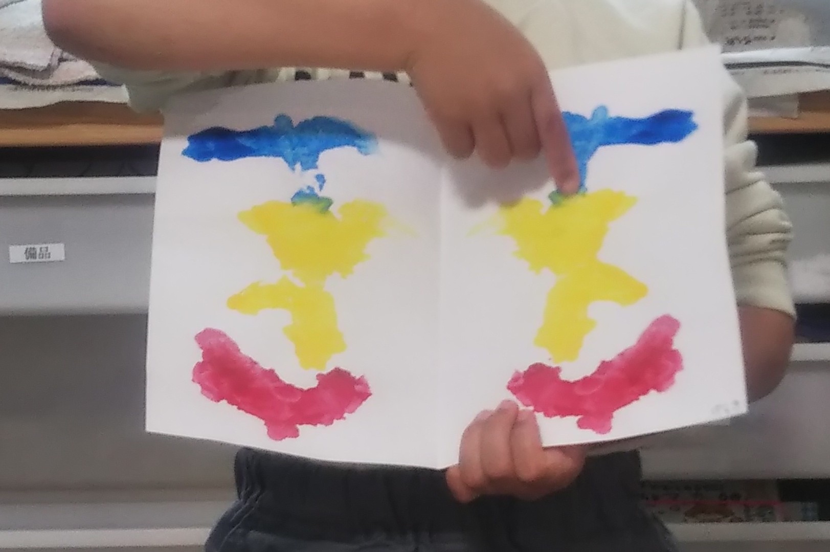 デカルコマニーは紙に絵の具を塗って別の紙を押し当てて転写する描画技法ですが、今回は紙を半分に折り、片側に色を塗って折り目に沿って折ることで転写する方法も行いました。描画自体を楽しむだけでなく描く前にどんな形になるかな?と予想したり、実際に転写して何見えたかを質問することで出来上がる造形のイメージする力を引き出す目的もあります。片側に人を描いて紙を開くと「2人になった!」と予想と一致するお友だちもいました。また、色や形からロボットをイメージしたり同じ絵でも上下逆さにしてと提案し、見方を変えるお友だちもおり、お花がドレスを着たお姫様に見えたり様々な見方をして出来上がりを楽しんでいましたよ。