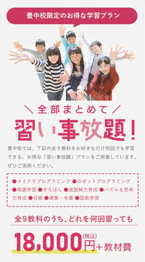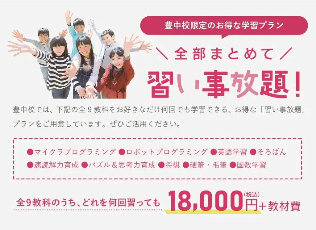 複数種類の異なる習い事をいくつでも学べる定額固定プランも選択できますので、様々な能力を鍛え上げることができるようになります。