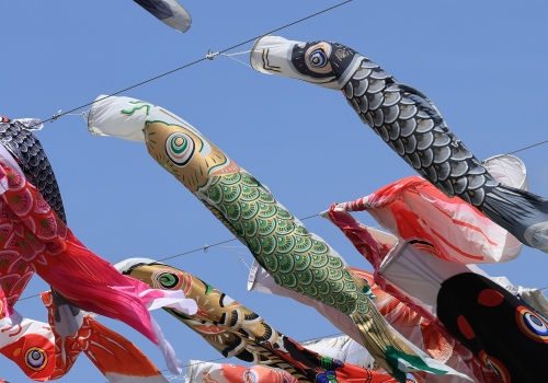 アートプログラムでブロックを作った様子です。こいのぼりの見本を見ながらまねっこしました。作ったこいのぼりを飾る街もみんなで作りました。