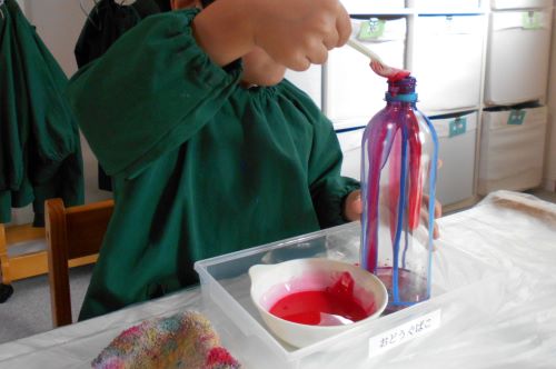 アートプログラムでは、色水あそび(ジュースづくり)を行いました!子どもたちが選んだ色の絵の具を混ぜ、色の変化を楽しんでいきます