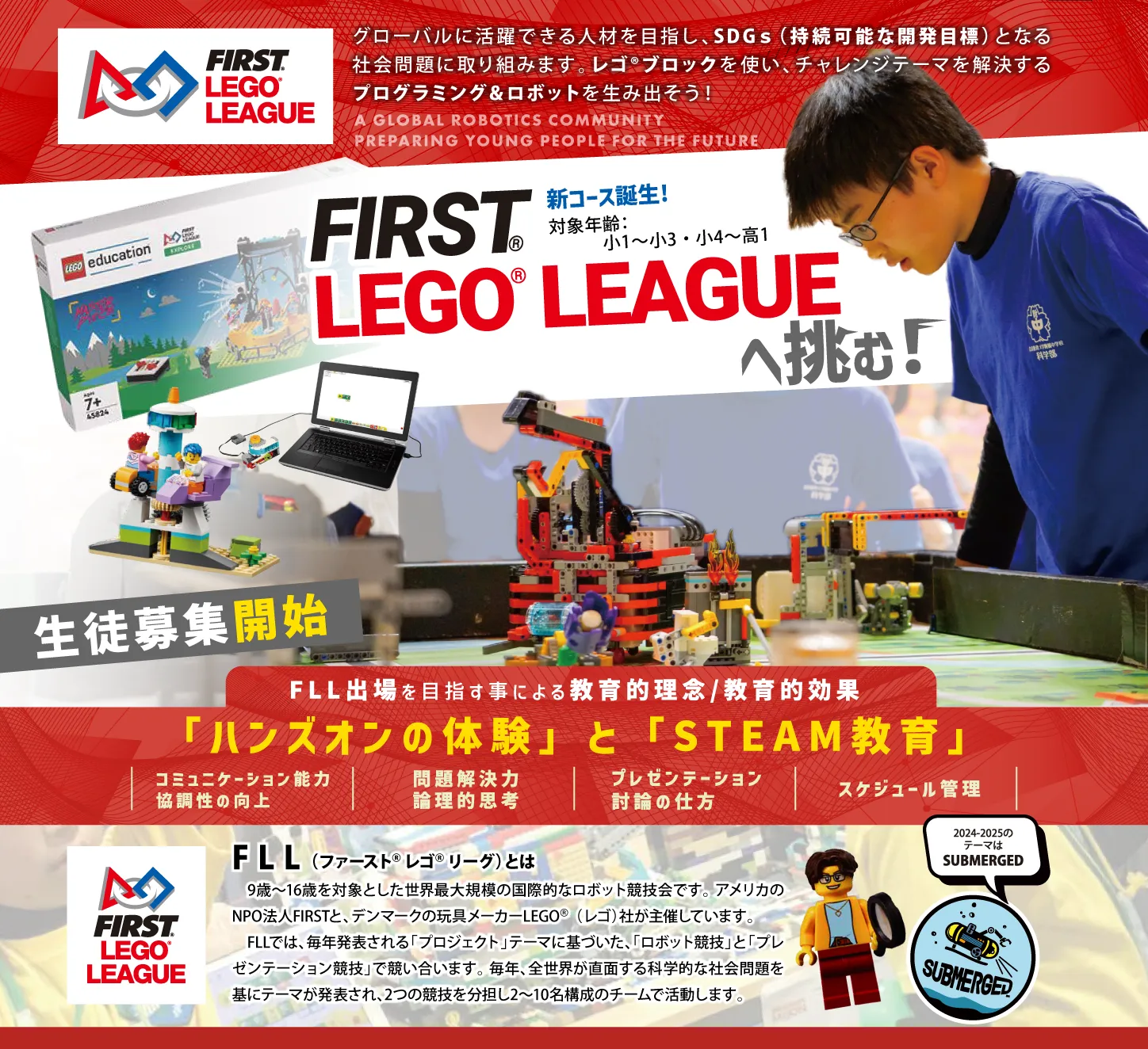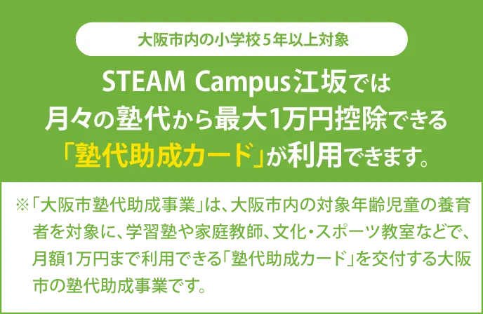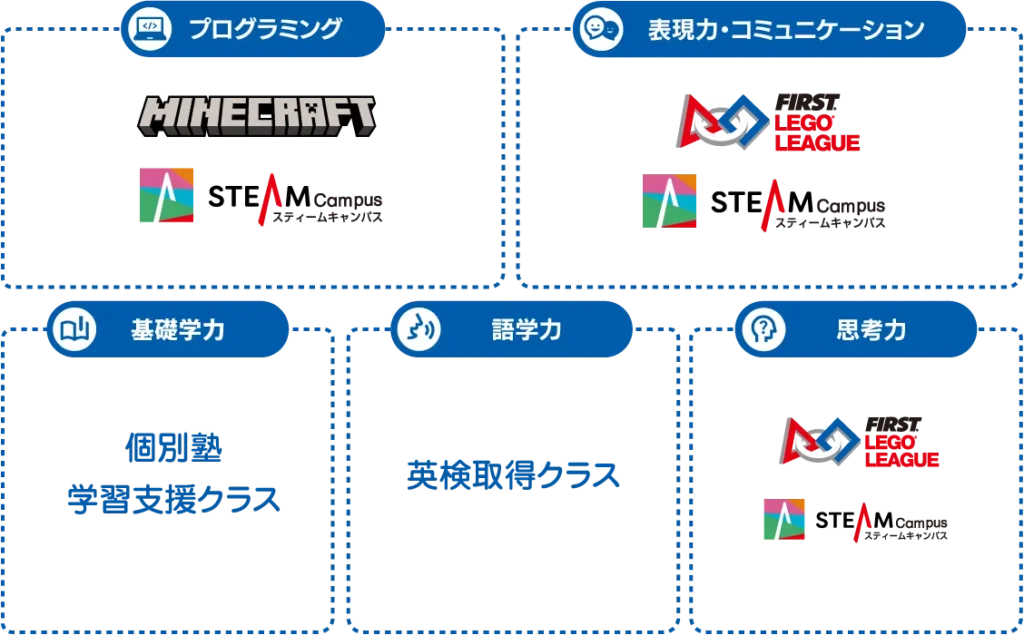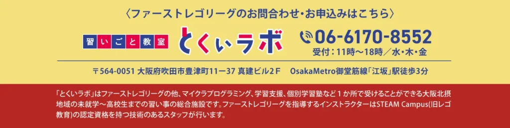 大阪北摂地域の未就学児~高校生までの習い事の総合施設です。ファーストレゴリーグだけでなく、マイクラプログラミング、学習支援、個別学習塾などが1か所で受けることができる施設です。ファーストレゴリーグを指導するインストラクターはSTEAM Campusの認定資格を持ち、STEAM教育の指導に明るいスタッフが行います。