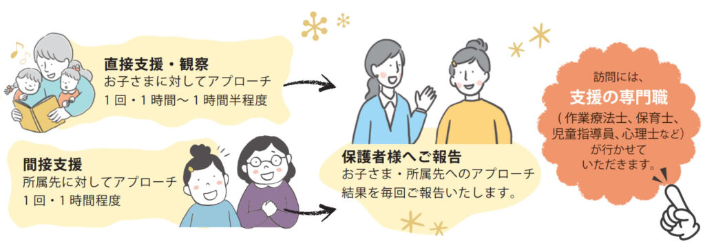 お子さまの行動に関連する要因や強みに関する見立から、訪問員が直接、要因や強みにアプローチしていきます。
