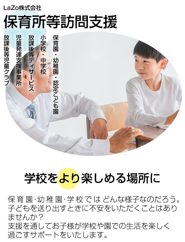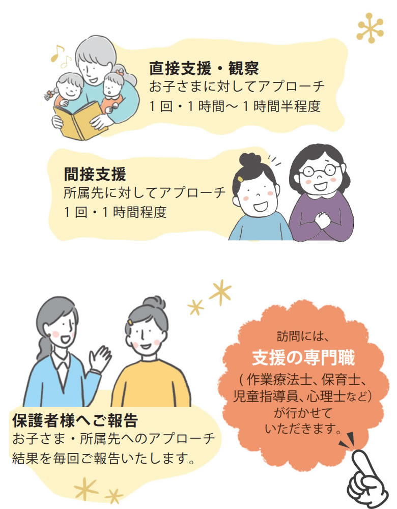 学校や園と言った施設等に専門知識を持ったスタッフが訪問し、保護者と施設との橋渡しを行い、お子様が学校や園での生活を楽しく送れるようなサポートを行います。