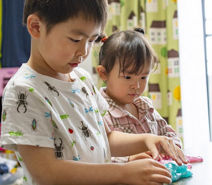 「手で触る、目で見る、頭で考える」などブロックや絵画などの年齢合わせたクリエイティブ教育をプログラムとして取り入れ、年齢に合わせた目標や支援内容に加え、子どもたちが自ら考えて取り組む能動的な活動を重視しています。
