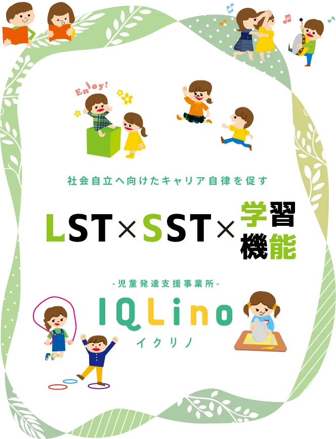 未就学時で行うIQLino独自プログラムである発達段階に応じたプログラムとクリエイティブ教育をさらに発展させたうえで、社会自立で必要なSST(社会的能力)、LST(生きる力)に重きをおいた療育を行います。