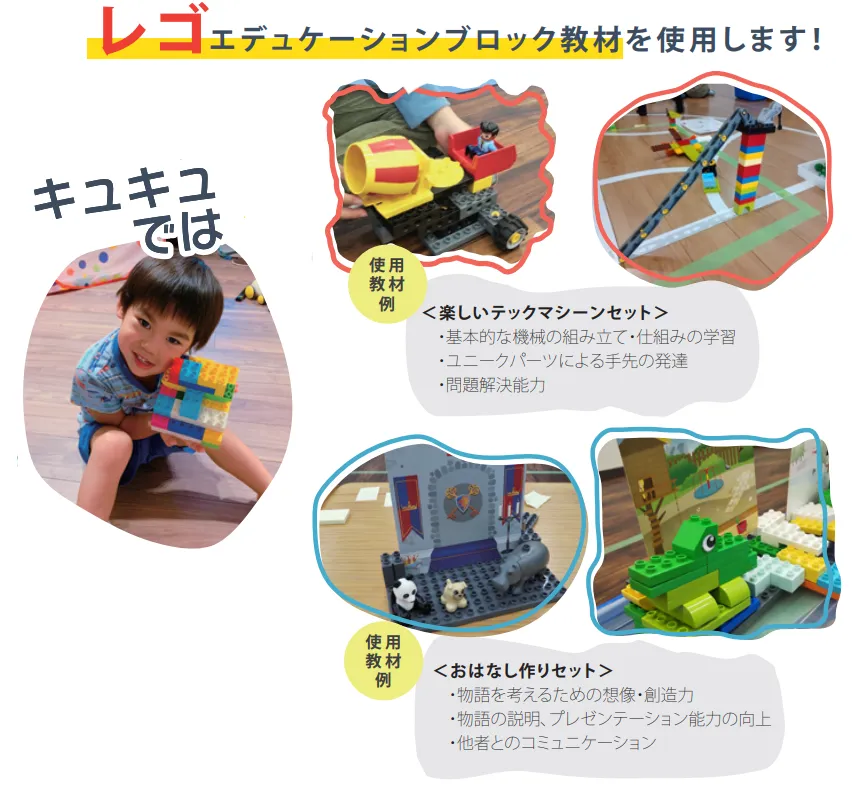子供たちが大好きなレゴ社のレゴエデュケーション教材を使用して、遊びの中で学べる仕組みが散りばめられています。手で触り・頭で考える・お話するなどの1つ1つが子供たちの成長に導きます。