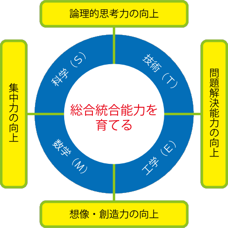 集中力向上、想像・創造力向上、論理的思考の向上、問題解決能力の向上が見込め、STEMの基礎学習を通じて、グローバル時代に活躍できる創意的な人材育成を目指します。