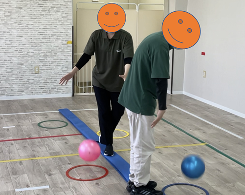 SMASPOでは、ボールや様々な道具を使った『バルシューレプログラム』と、着脱の練習や姿勢保持・体幹の強化に向けて『感覚統合プログラム』を行っています。